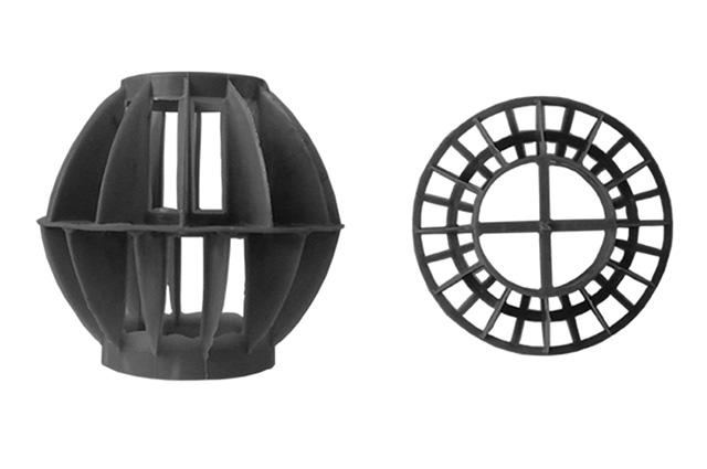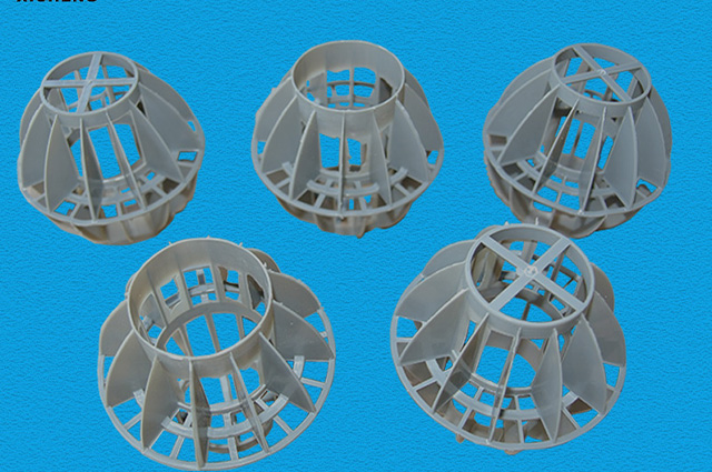 多面空心球中間鏤空結構形成空隙大,不易被阻塞的特性。這種結構在空氣洗滌、廢氣吸收、灰塵過濾等廢氣處理工程方面應用,具有處理風量大、阻力小的特點。由于多面空心球的空隙中有較高的滯液量,可使塔內液體停留時間長,從而增加了氣體與液體的接觸面積和接觸時間。